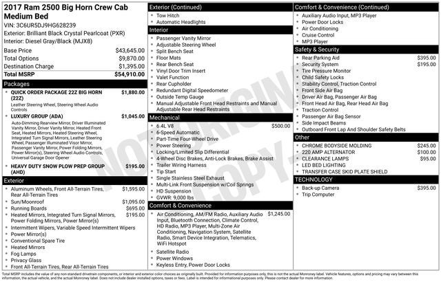 Local trade! Recent Arrival! **LOCAL TRADE**, **Recent Arrival**, 2500 Big Horn, 4D Crew Cab, 6.4L Heavy Duty V8 HEMI w/MDS, 6-Speed Automatic, 4WD, Brilliant Black Crystal Pearlcoat, Diesel Gray/Black Cloth, 115V Auxiliary Power Outlet, 40/20/40 Split Bench Seat, Anti-Spin Differential Rear Axle, Auto-Dimming Exterior Mirrors, Auto-Dimming Rear-View Mirror, Big Horn Badge, Big Horn Regional Package, Bright/Bright Billets Grille, Center Hub, Charge Only Remote USB Port, Electroluminescent Instrument Cluster, Exterior Mirrors Courtesy Lamps, Exterior Mirrors w/Supplemental Signals, Fog Lamps, Folding Flat Load Floor Storage, Front Armrest w/Cupholders, Front Center Seat Cushion Storage, Glove Box Lamp, GPS Navigation, Heated Front Seats, Heated Seats & Wheel Group, Heated Steering Wheel, Heavy Duty Snow Plow Prep Group, Leather Wrapped Steering Wheel, Luxury Group, Overhead Console w/Garage Door Opener, Power 10-Way Driver Seat, Power Folding Mirrors, Power Lumbar Adjust, Premium Cloth 40/20/40 Bench Seat, Quick Order Package 22Z Big Horn, Rear 60/40 Split Folding Seat, Rear Dome w/On/Off Switch Lamp, Remote Start System, SiriusXM Traffic, Steering Wheel Mounted Audio Controls, Storage Tray, Sun Visors w/Illuminated Vanity Mirrors, Underhood Lamp, Universal Garage Door Opener, Wheels: 18 x 8.0 Polished Aluminum.